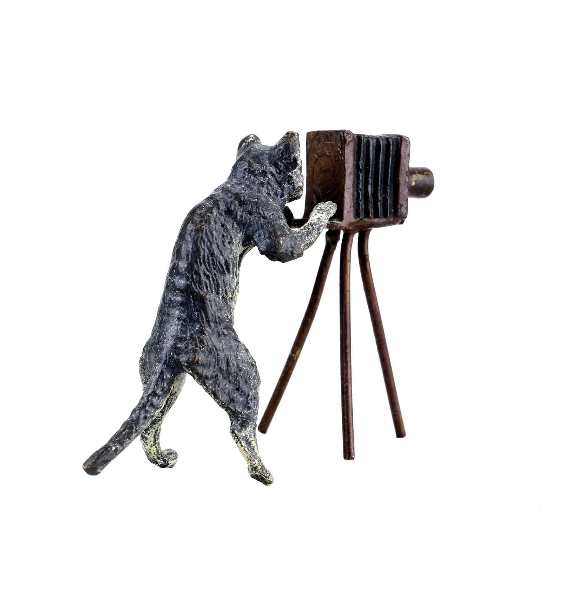 The depiction of animals was one of the main motifs of the Vienna Bronze period. Over time, there was a shift away from authentic animal portrayals to more imaginative depictions. Putting dogs, cats, pigs and other animals into situations of human everyday life achieved an absolute cult status. Thus, this Vienna Bronze Cat also falls into patterns of human behaviour by busily clicking away on its camera. Painted and stamped by hand, this small cat figurine is a prime example of Vienna Bronze art.